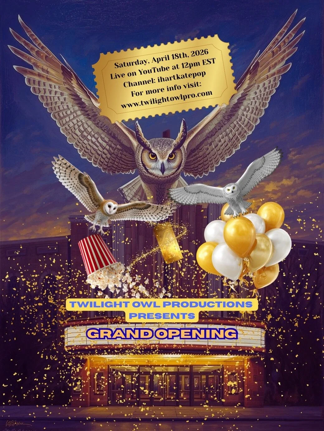 Join us online for a live YouTube premiere event for the official grand opening of Twilight Owl Productions, LLC! This is a free admission event! Saturday, April 18th, 2026 at 12pm EST on our YouTube channel: ihartkatepop. Check out more info on our box office page, and you can also access our YouTube channel: ihartkatepop on there too!